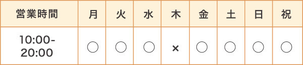 | 営業時間 | 10:00〜20:00 |
